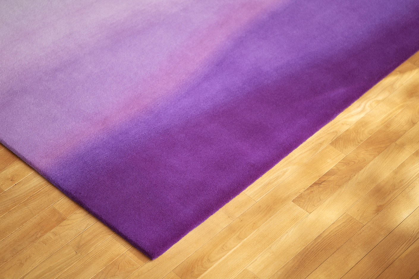 静かに雨が降り続く、梅雨。梅雨空と山々が滲む風景を、紫のグラデーションで表現したじゅうたんです。静謐な佇まいで、現代の暮らしに、穏やかな自然と空の情景を取り込みます。