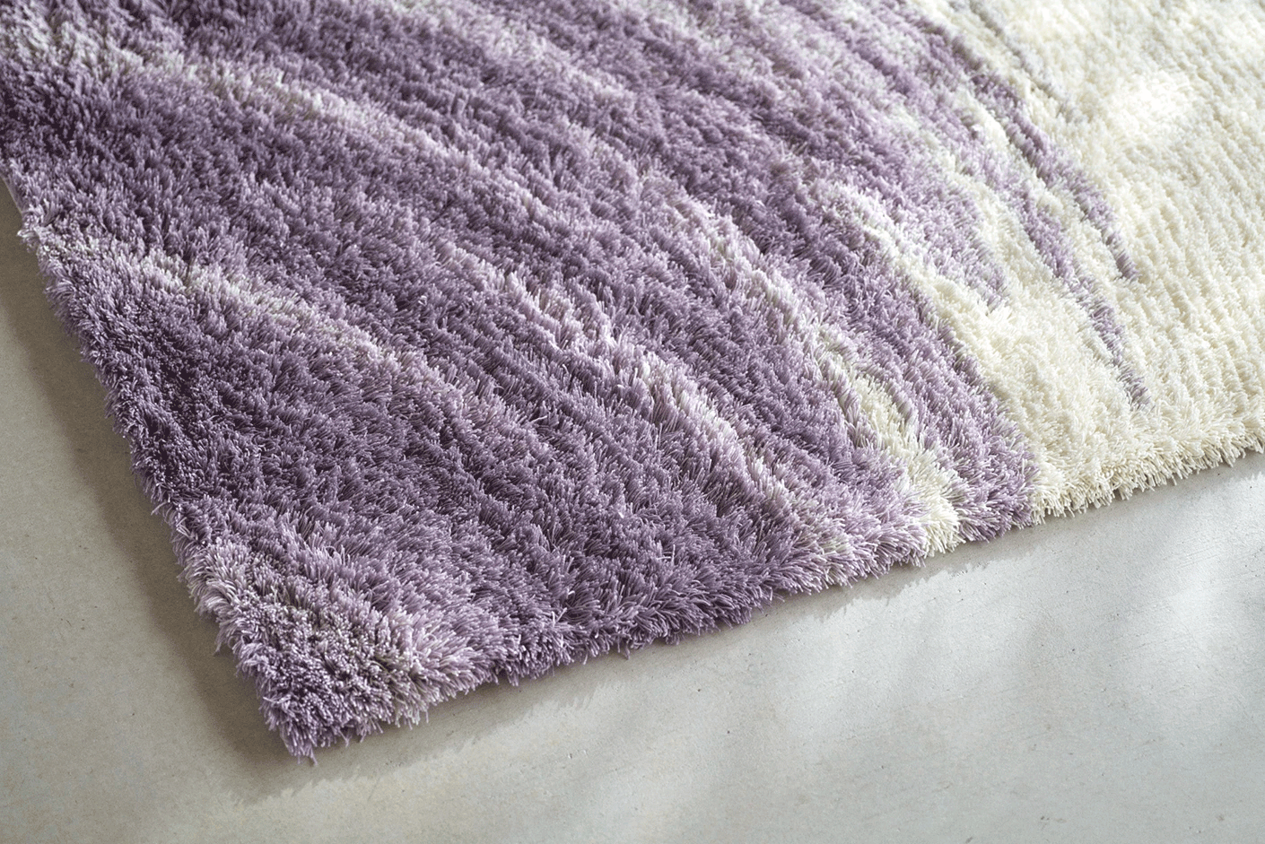 流れる波の景色を、様々なグラデーションで表現したじゅうたんです。ニュージーランド産光沢種羊毛をふんだんに使用した、素材そのものの素朴な風合いや佇まいが、空間に寄り添います。(通常製品と比較し毛足が長く、遊び毛が出やすい傾向があります)
