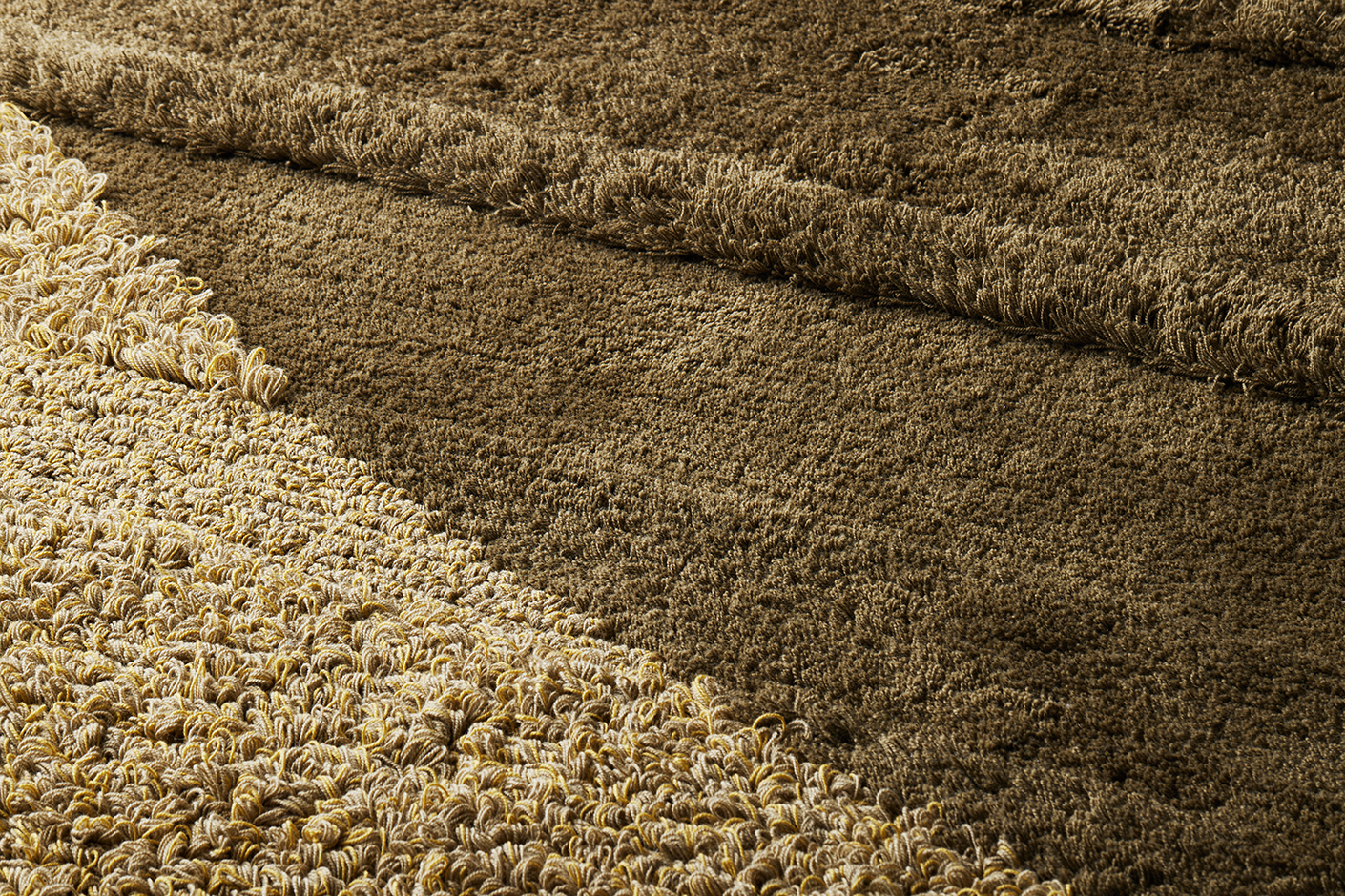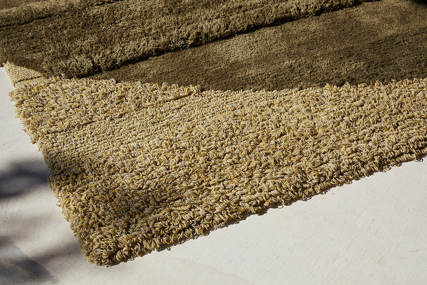日本におけるインテリアデザインの黎明期を築いたデザイナー・剣持勇。その最晩年にインテリアを手掛けた、京王プラザホテル(1971年竣工)のエントランスロビーのために製作した手刺緞通です。手刺の製法を活かし、複数パターンの織り方、太さ違いの糸、毛足の短長等の差異を意識的に取り入れることで、平面を超えたリズム感と有機的なテクスチャが生まれています。